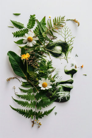 Womans face transformed with ferns and wildflowers depicting the beauty of nature in artistic fashionportrait