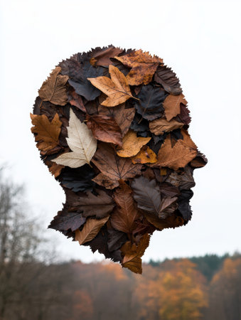 Autumn leaves forming a human head silhouette against a blurred forest background