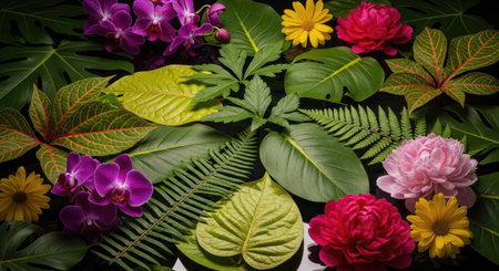 Variety of colorful tropical leaves and flowers on a black background.