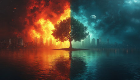 A captivating collage showcasing the duality of nature, featuring intense forest fires juxtaposed with calming views of wilderness, dramatic skies, and vibrant northern lights.