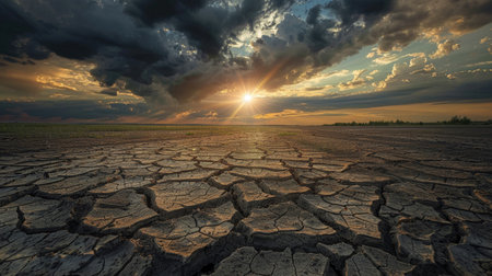 A Vast landscape of dried, cracked earth under a dramatic cloudy sky, depicting drought conditions.