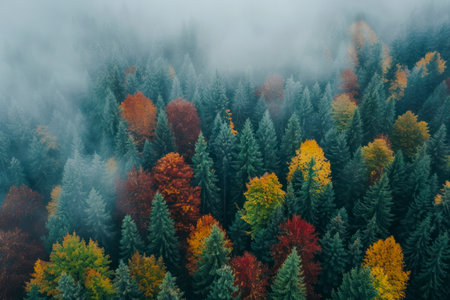 Misty Autumn Forest Landscape, Scenic View of Trees with Colorful Foliage in a Foggy Valley