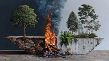 A striking image that juxtaposes a burning forest against vibrant greenery, highlighting the stark contrast between destruction and preservation in nature.