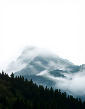 A magical forest scene where ethereal mist envelops evergreen trees, creating a tranquil atmosphere. Soft morning light breaks through the fog, revealing enchanting nature.