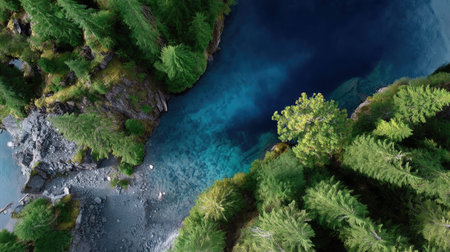 This stunning aerial photograph captures the breathtaking beauty of a lush green forest encircling a serene blue water lake. Ideal for nature lovers.