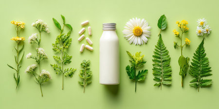 Herbal arrangement with a bottle, capsules, and various flowers/leaves on a green surface