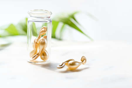 Serum capsules for healthy skin. Close-up on transparent bottle with the capsules. Green palm leaf.
