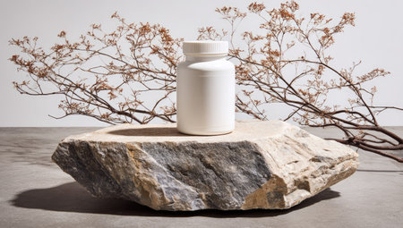 White supplement bottle sits atop a natural stone pedestal, which is situated against a neutral backdrop. Dried plant branches create a serene and natural aesthetic around the bottle. The image highlights the bottle and its placement on the stone pedestal.