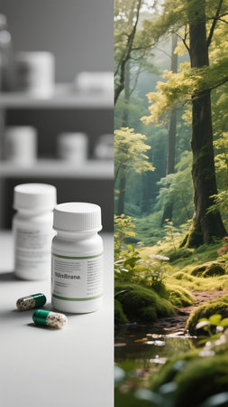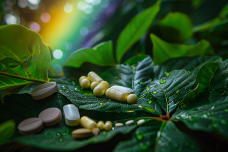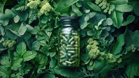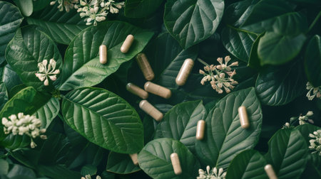 Herbal capsules rest surrounded by vibrant greenery, showcasing a serene and tranquil atmosphere that highlights nature's abundance and wellness.