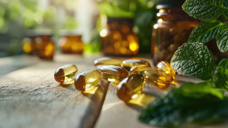 Herbal capsules and essential oil bottles sit alongside fresh mint leaves, bathed in soft sunlight.