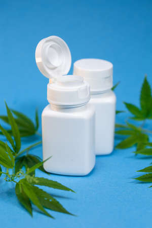 white jar and cannabis on a blue background.