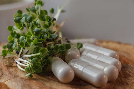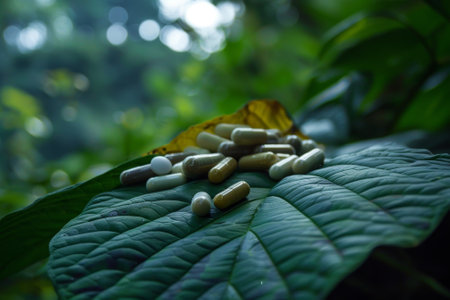 Alternative medicine herbal organic capsule drug with herbs leaf natural supplements for healthy good life.