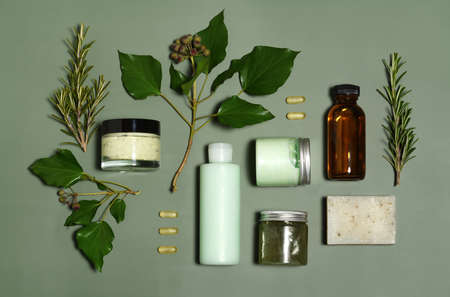 Arrangement of organic pills, skin care products and plants