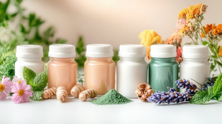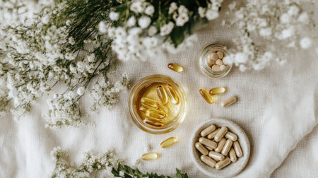 Beautiful flat lay of natural wellness items featuring herbal supplements and delicate flowers on a soft background. Perfect for promoting healthy living and self-care.