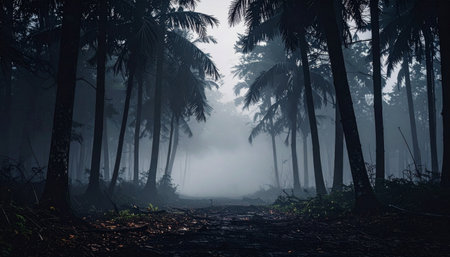Mysterious fog envelops a lush forest creating an atmospheric escape