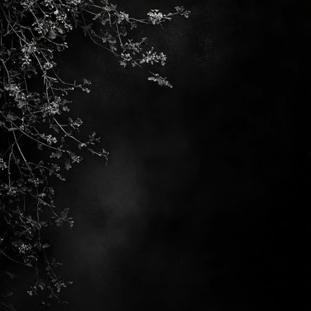 Dark minimalist background with subtle branches and leaves.