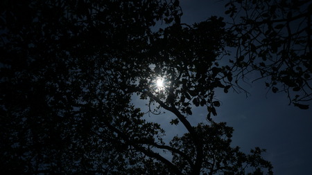 silhouette of a tree branch with a background of sunlight and a rather dark sky in summer