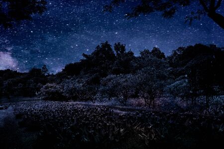 Blue dark night sky with many stars above field of trees