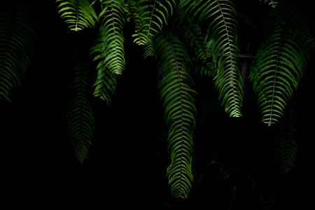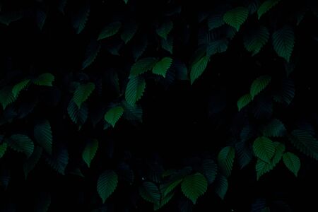 Plant branches with green leaves close up view. Natural environment, ecology, lush forest trees foliage. Beautiful botanical background with copyspace. Illuminated greenery at nighttime