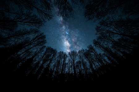 Bottom view of the starry sky with the milky way in the night forest