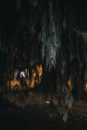 dark moody evergreen thuja tree background