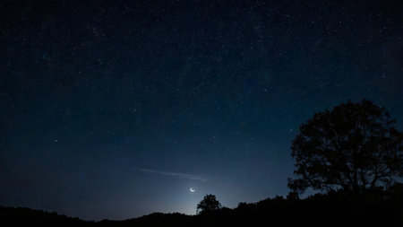 Stars twinkle bright in a clear night sky, casting a serene glow over tall trees. The silhouettes create a peaceful atmosphere in a secluded forest landscape.