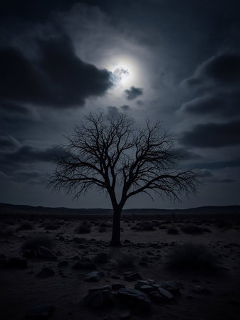 Mysterious dark foggy forest with tree branches in a dark foggy night