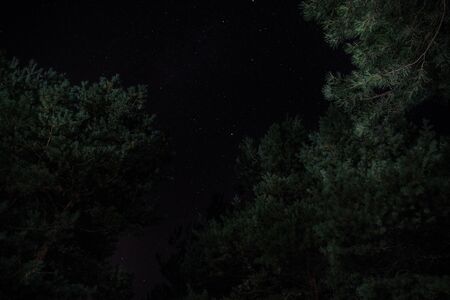 Night sky with clear stars with fir tree forest below
