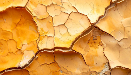 An abstract pattern of cracked dry mud displays swirling hues of orange and yellow, showcasing a detailed natural texture.