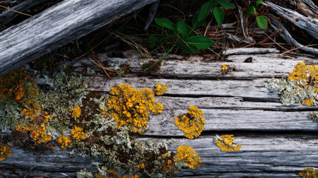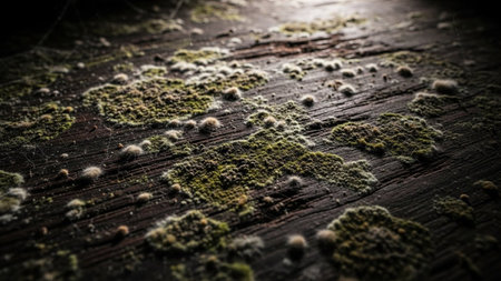 A detailed macro view reveals the intricate textures of mold and lichen growing on a weathered, dark wooden surface. Patches of fuzzy green and gray organic growth, with bumpy and irregular formations, cover the aged wood. The scene highlights the natural processes of decay and life, showcasing a complex, earthy pattern. is scientific, biological, or abstract concepts related to nature, aging, or the environment.