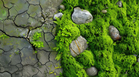 This captivating image captures the stark contrast between vibrant moss-covered stones and dry, cracked soil, showcasing nature's resilience and beauty.