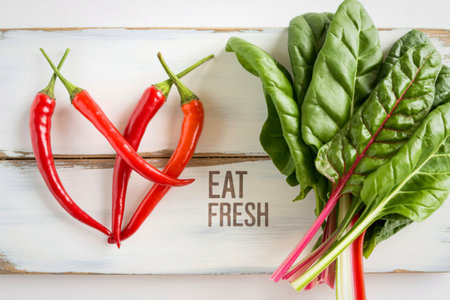 Two red chili peppers are arranged in a heart shape next to a bunch of vibrant green leafy vegetables on a rustic wooden background.