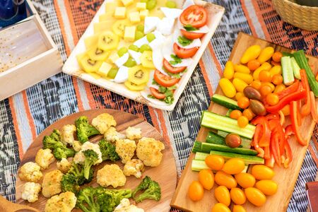 Slised vegetables on wooden board outside. Fresh vegetables outdoors on checkered napkin. Zucchini, eggplant, mushrooms and broccoli.