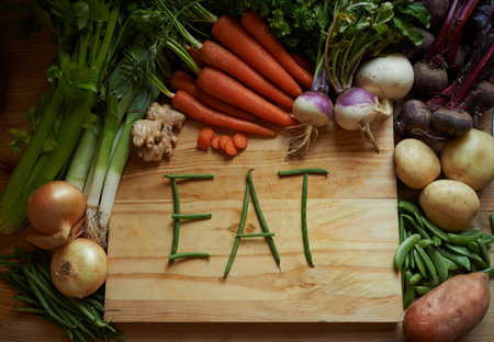 Fresh from the earth. Still life shot of a variety vegetables on a chopping board with the message eat.