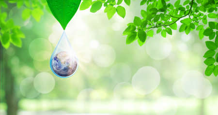 Ecology and Environment Concept : Blue earth in water drop with green natural in background.