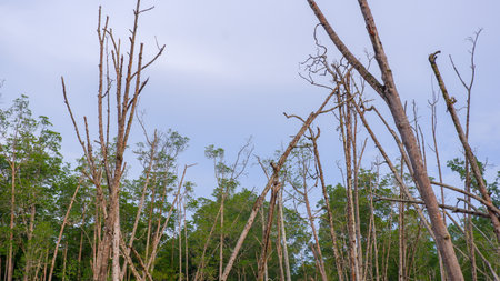 A stunning view of dead, leafless trees standing in a degraded coastal forest, against a backdrop of green foliage and a clear blue sky.