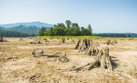 Tree stumps after deforestation located around mountain lake