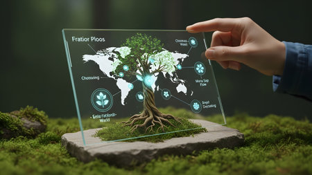 Touching showing hand touching transparent screen displaying map with tree and scientific data....