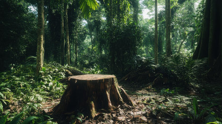 Clear-cut forest area with tree stumps and scattered debris under an ominous sky. The land is prepared for future uses but shows significant environmental impact.