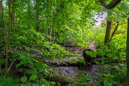 fallen tree over small stream inside of a forest during end of autumn season in Rosochacz nature reserve in Poland