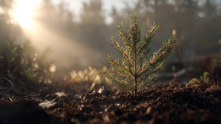 A cinematic wide shot of a young Scots pine growing, slightly larger than before, its trunk and branches beginning to take shape, surrounded by rich, dark soil and faint morning mist, golden sunlight breaking through the clouds, soft beams illuminating the growing tree, ultra-realistic photography with true Earth like realism natural hues, no artificial colors, deep 3D parallax depth creating an immersive, awe inspiring atmosphere, subtle natural lens flares, minimal 35mm film grain, tranquil and hopeful tone, 8K, highly detailed.