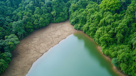 Aerial view of a river flowing through the forest in Thailand.