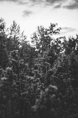 Young cute stylish guy dreams in green and lush fir branches on a summer day