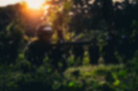 War Concept. Military silhouettes fighting scene on war fog sky background, World War Soldiers Silhouettes Below Cloudy Skyline At night. Attack scene. Armored vehicles. Selective focus. Decoration