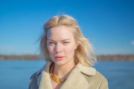 Portrait of cute blonde girl in blue dress outdoors. Nice woman posing on nature landscape