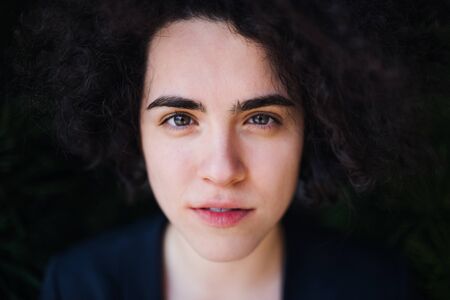 Face of a young brunette woman woman with natural makeup and curly hair outdoors