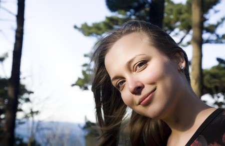 Portrait windswept hair happy woman against a backdrop of mountains and sea. Daylight illuminates the tranquil outdoor setting