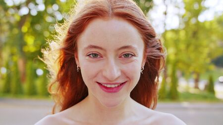 Portrait of pretty young woman with curly copper flowing hair and freckles smiling to camera at bright sunset back light close view