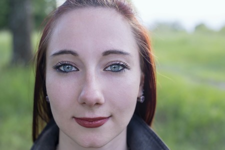 Portrait of a red-haired girl with bright blue eyes outdoors