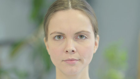 A shallow focus of a Bosnian Caucasian woman looking at the camera with a serious face